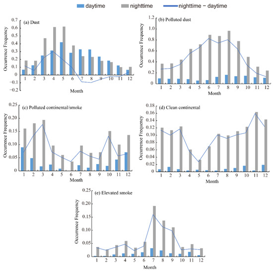 Monthly occurrence frequencies of five subtypes in the daytime and nighttime from 2007 to 2021: (a) dust; (b) polluted dust; (c) clean continental; (d) polluted continental/smoke; (e) elevated smoke.