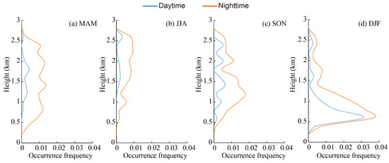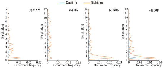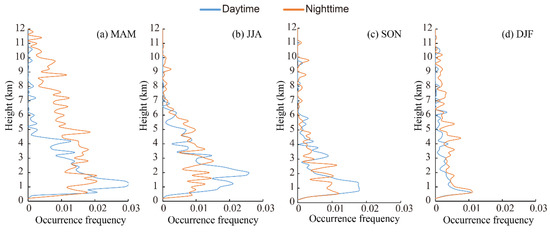 The elevated smoke layer was mainly distributed over a range from 2.5 to 6.0 km above the mean sea level (Figure 9). The occurrence frequency in the nighttime was much higher than that found in the daytime, which is consistent with the diurnal variation feature found in other regions [78]. In spring, the elevated smoke layer peaked at approximately 3.5 km with a maximum occurrence frequency of 0.005 in the nighttime, then decreased sharply with height. The occurrence frequency of elevated smoke in summer was less than 0.005 in the daytime and approximately 0.015 in the nighttime with significant differences, which may result from biomass burning in this season [90]. In autumn, elevated smoke showed the same features as those found in spring, peaking at 3.0 km. Both the height and the frequency of occurrence were lower than those recorded in summer. In winter, the elevated smoke layer was seldom observed in any range, and its occurrence frequency was less than 0.003 at all heights.