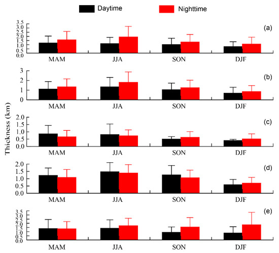 Variations in the mean thicknesses of aerosol subtype layer in the Aral Sea region in the daytime and nighttime from 2007 to 2021: (a) dust; (b) polluted dust; (c) clean continental; (d) polluted continental/smoke; (e) elevated smoke.