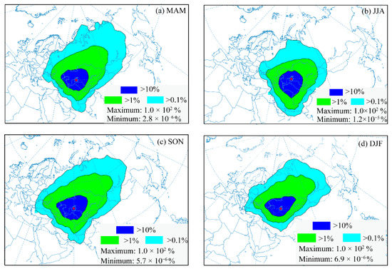 The zone that is frequently impacted by atmospheric aerosols from the Aral Sea region showed marked seasonal features (Figure 11). In spring, the Asian high leads to prevailing northeasterly and southwesterly winds in this region [61]. The severely impacted zone (blue zone) extended westward at a low height, and was mainly distributed around the Aral Sea region, but also in neighboring areas and had the potential to cover most of Central Asia (covering an area of approximately 2 million km2), including western Kazakhstan and most of Uzbekistan and Turkmenistan (Figure 11a). This can be seen more clearly in Figure 12c–e. After lifting to a higher altitude, the aerosols can be transported over a long distance toward the east or northeast due to the perennial westerly belt (Figure 11a and Figure 12c–e). The moderately impacted zone (green zone) covers a larger area, including Uzbekistan, Kazakhstan, Turkmenistan, Kyrgyzstan, and part of Iran, and even the Caucasus region, extending eastwards towards Russia’s Siberia, particularly to the Tianshan Mountains, with potentially lower atmospheric aerosol concentrations (greater than 1% and lower than 10%). The lightly impacted zone (light−blue zone in the figure) in spring comprised the areas with the lowest levels of air aerosols (>0.1%), stretching to the central Siberian Plateau and eastern Siberia in the eastern branch, covering most of Russia, Mongolia and the northwest of China.