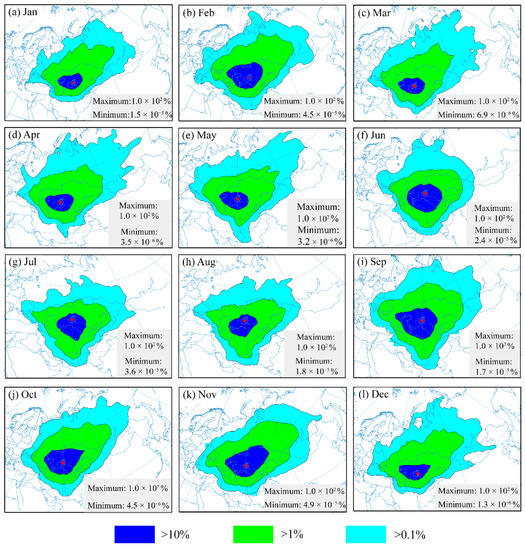 This section explores the zone most frequently impacted by aerosols from the Aral Sea region after presenting the variation features of the atmospheric aerosol subtypes for the Aral Sea region over the past fifteen years. The HYSPLIT model’s trajectory frequency analysis counts the number of endpoints along one trajectory that fall within each grid cell (1.0 degree in this study), then normalizes the data by the total number of trajectories [63]. The frequency analysis of air parcel trajectories provides information regarding certain regions that are regularly impacted by atmospheric aerosols from the Aral Sea region. There were three trajectory frequency classes (%) presented. The severely impacted zone has a frequency of trajectory larger than 10% but less than 100% (maximum), the moderately impacted zone has a frequency of trajectory larger than 1% but less than 10%, and the lightly impacted zone has a frequency of trajectory larger than 0.1% but less than 1% [63]. The trajectory frequency classes between 0.1% and the minimum value are not presented in the figures due to the low trajectories or lack of possibility to transport the aerosols to the downwind area of the Aral Sea.