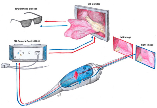 In the 1990s, endoscopic surgery spread and was used in various specialties. In the following years, imaging systems enabling three-dimensional visualization were developed. The 3D-imaging method was first used in gynecology in 1993 [10]. Three-dimensional laparoscopes have two cameras placed next to each other, which simulate the left and right eyes. The images from the cameras overlap each other to enable the generation of stereoscopy [11] (Figure 1). The surgeon, after putting on special glasses in which the right and left lenses transmit light of different polarization, can see an image of illusory depth (Figure 2). The objective of this study was to evaluate the safety of 3D versus 2D laparoscopic hysterectomy during the COVID-19 pandemic.