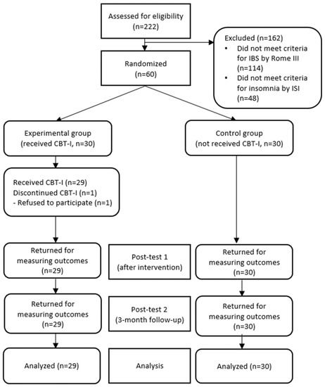 A total of 222 participants were screened, 114 of which were excluded because they did not meet the Rome III criteria for IBS, and 48 participants were excluded because they scored below 10 points on the Insomnia Severity Index. The 60 participants who met the inclusion criteria all agreed to participate in the study and were randomly assigned to the experimental group (n = 30) and the control group (n = 30). During the study, one participant declined the intervention due to schedule conflict with his/her part-time job, thus a total of 59 participants, 29 from the experimental group and 30 from the control group, participated in and completed the study.