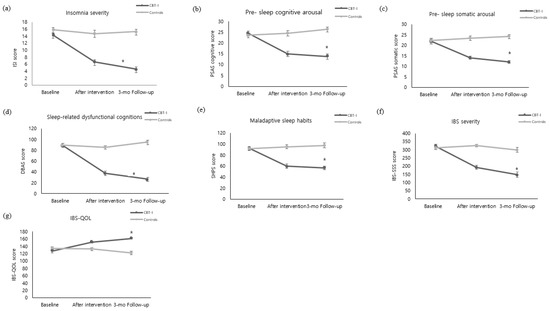 Comparison of outcome variables of the experimental and control groups over time ((a) Insomnia severity. (b) Pre-sleep cognitive arousal. (c) Pre-sleep somatic arousal. (d) Sleep-related dysfunctional cognitions. (e) Maladaptive sleep habits. (f) IBS severity. (g) IBS-QOL). The p value was calculated using repeated measured ANOVA. CBI-I: Cognitive behavioral therapy for insomnia. ISI: Insomnia Severity Index. PSAS: Pre-Sleep Arousal Scale. DBAS: Dysfunctional Beliefs and Attitudes about Sleep Scale. SHPS: Sleep Hygiene Practices Scale. IBS: Irritable Bowel Syndrome. IBS-QOL: Irritable Bowel Syndrome-Quality of Life. * p < 0.001.