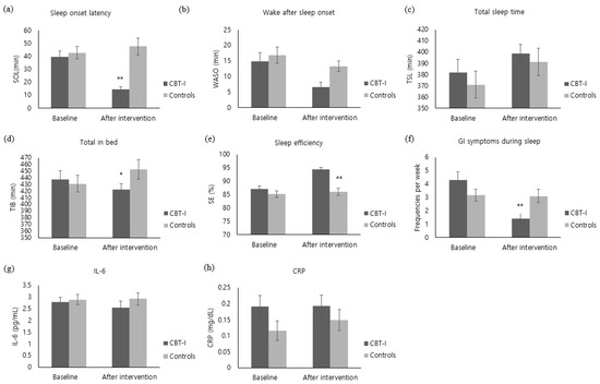 Comparison of outcome variables of the CBT-I and the control groups at baseline and after intervention ((a) Sleep onset latency. (b) Wake after sleep onset. (c) Total sleep time. (d) Total in bed. (e) sleep efficiency. (f) GI symptoms during sleep. (g) IL-6. (h) CRP). CBI-I: Cognitive behavioral therapy for insomnia. SOL: Sleep Onset Latency. WASO: Wake Time after Sleep Onset. TST: Total Sleep Time. TIB: Total Time in Bed. SE: Sleep Efficiency. GI: Gastrointestinal. IL-6: Interleukin-6. CRP: C-Reaction Protein. * Cognitive behavioral therapy for insomnia (CBT-I) group versus control group, p < 0.05. ** Cognitive behavioral therapy for insomnia (CBT-I) group versus control group, p < 0.001.