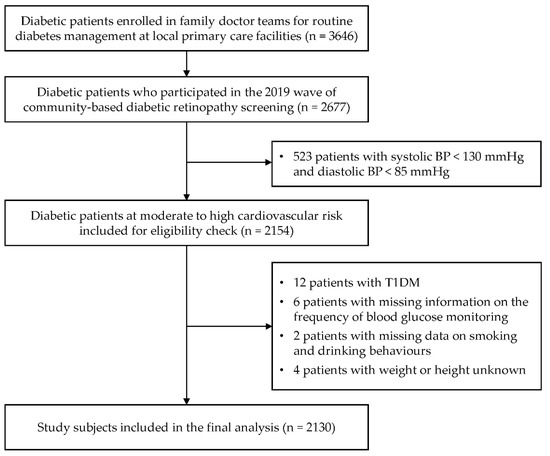 Flow chart of the study. T1DM, type 1 diabetes mellitus; T2DM, type 2 diabetes mellitus; BP, blood pressure.