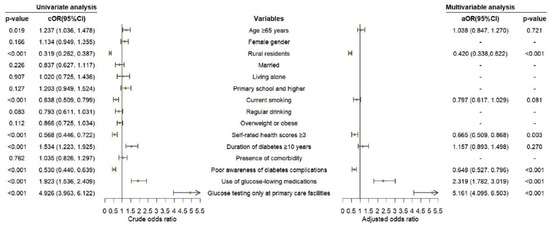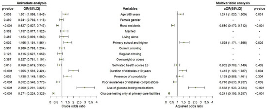 In the univariate analysis, age, place of residence, education level, self-rated health scores, duration of diabetes, presence of comorbidity, awareness of adverse consequences of diabetes complications, use of glucose-lowering medications, and venues for testing blood glucose were associated with the frequency of blood glucose monitoring (p <0.05), which were further entered in the multivariable analysis. In the further analysis, the following factors remained significantly associated with having blood glucose monitored once or more per month: age ≥ 65 years (aOR = 1.241, 95%CI: 1.020–1.509; p = 0.031), living in rural areas (aOR = 0.580, 95%CI: 0.472–0.712; p < 0.001), having formal education (aOR = 1.529, 95%CI: 1.171–1.996; p = 0.002), having a diagnosis of diabetes for over 10 years (aOR = 1.415, 95%CI: 1.120–1.787; p = 0.004), poor awareness of adverse consequences of diabetes complications (aOR = 0.770, 95%CI: 0.633–0.937; p = 0.009), use of glucose-lowering medications (aOR = 2.538, 95%CI: 1.933–3.334; p < 0.001), and having blood glucose tested only at primary care facilities (aOR = 0.241, 95%CI: 0.196–0.297; p < 0.001) (Figure 3).