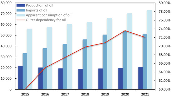 Oil is a critical resource that ensures a country’s economic and social growth and plays a vital role in production and survival. Oil security is intimately tied to a country’s future and fate [1]. As people’s living standards continue to rise and industrialization advances, China, the world’s top crude oil importer, has a widening disparity between supply and demand for crude oil. As indicated in Figure 1, China’s crude oil import dependency was 72.05% in 2021, which is much higher than the International Energy Agency’s warning line for crude oil import dependency [2], thus international oil market fluctuations will have a stronger influence on China’s oil security.