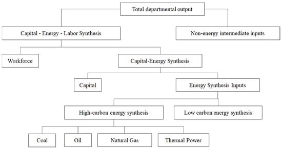 As seen in Figure 3, the production module is divided into five layers of nested functions: the first layer synthesizes capital–energy–labor and non-energy intermediate inputs; the second layer synthesizes labor inputs and capital–energy; the third layer synthesizes capital and energy; the fourth layer synthesizes high-carbon energy and low-carbon energy; the fifth layer synthesizes coal, oil, natural gas, and thermal power. Each layer is in the form of a CES function.