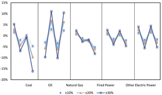 The upstream and downstream of the industrial chain in many industries will be impacted by swings in international oil prices as China’s industrial production capacity expands, bringing increased uncertainty to the operation of linked firms. Table 3 depicts the effect of several scenarios on the output of each industry. In Scenario 1, the production of agriculture, heavy industry, light industry, transportation, and service industry all decline, with agriculture and light industry declining the most. The reason for this is that the increase in international oil prices reduces the quantity of oil inputs and increases the amount of labor inputs in order to save money, hence increasing the price of labor and causing labor-intensive sectors to suffer more severe harm. The sole reason why the rise in international oil prices has contributed to the production of the construction industry is that it will increase the cost of energy utilized by businesses. To save expenses, businesses will convert to substituting energy with inputs of production such as capital or labor. The increase in return on capital investment causes businesses to invest more in fixed assets, with the construction industry benefiting the most as a core component of fixed asset investment. In Scenario 2, the drop in international oil prices encourages the majority of industries to profit from lower intermediate input costs and output expansion. In response to falling international oil prices, domestic refined oil prices change in the same direction, transport costs decrease, and transportation industry output rises. The fall in international oil prices causes enterprises to replace a portion of their capital with oil, although the construction industry has a negligible decline as the economy as a whole improves. Comparing Scenario 1 with Scenario 2, it is evident that the effects of rising and dropping international oil prices on the industrial sector are opposite and asymmetric, and for the majority of industries, the effects of falling international oil prices are stronger.
