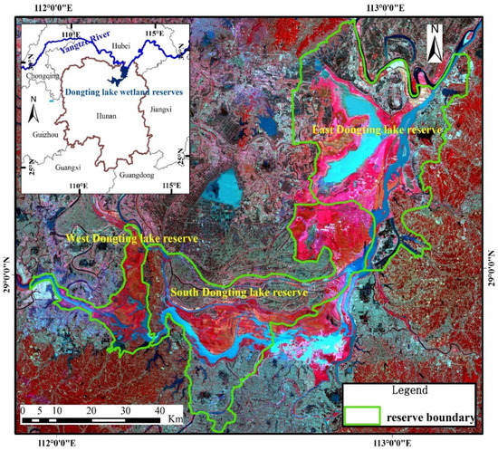 Dongting Lake is located in the north of Hunan Province (28°30′~30°20′ N, 110°40′~113°10′ E), and is the second-largest freshwater lake in China [29]. The lake has a subtropical monsoon climate that is characterized by a rainy season between April and September and a dry season between October and March. Dongting Lake, with smooth relief, tends to be influenced by seasonal precipitation, and may undergo significant changes over several days [34]. During the rainy season, the lake provides storage for river flood waters. During the dry season, it provides water to the river to allow river transportation to continue without significant interruption. Seasonal mudflats provide rare habitats and spawning grounds for migratory birds and fish [35]. High-frequency measurements are, therefore, needed to study short- and long-term fluctuations in the inundation areas of lakes. Dongting Lake includes three national wetland nature reserves (Figure 1), the East Dongting Lake wetland reserve, the South Dongting Lake wetland reserve and the West Dongting Lake wetland reserve, which were included in the list of Ramsar Sites in 1992 and 2002 [7]. Dongting Lake wetland reserves include various types of land cover. In this study, the classification system uses a two-tier hierarchical structure. Level 1 comprises two categories: wetlands and uplands. Level 2 comprises 7 categories: four types of natural wetlands (permanent water, permanent marsh, flooded wetland and seasonal marsh), an artificial wetland (paddy field), one type of natural upland (forest) and one type of artificial upland (construction land).