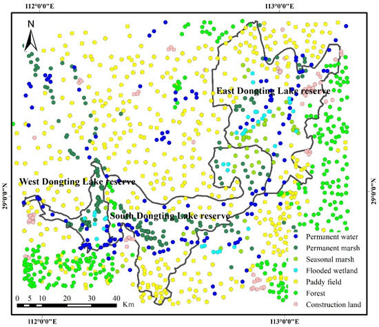 In this study, training and validation samples were used to train the classifier and evaluate the accuracy of the classification results, respectively. Initially, 2000 geolocation sampling points were randomly generated in the study region using ArcGIS (ESRI, Redlands, SC, USA) for each year. Subsequently, the samples were visually interpreted as permanent water, permanent marsh, flooded wetland, seasonal marsh, paddy field, forest and construction land based on remote sensing images with high spatial resolution from Google Earth (http://earth.google.com, accessed on 5 January 2022) and the characteristics of the reconstructed two-month composition time series data set (NDVI, NDWI and NDMI) for each land cover in the same year. Only the samples with 120 m × 120 m pure pixels were retained (Figure 2). Finally, these samples in each year were divided into two parts for training and validation; two thirds of these samples were randomly selected and used as training samples to classify, and the remaining one third of the samples were used as validation samples to verify the accuracy of the classification results.