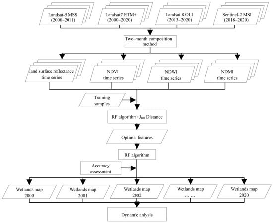 The framework for mapping seasonal wetlands developed in this paper is shown in Figure 3. We generated two-month time series with 54 features, including multi-spectral bands and indices (NDWI, NDMI and NDVI) for all time phases. To select the optimal features and improve the classification efficiency, importance scores for all these features were calculated based on the random forest algorithm using the training samples, and the ranking of importance scores for all 54 features were acquired. Afterwards, we calculated the separability among all wetland types using the extension of the Jeffries–Matusita (JM) distance (JBh); the number of features used increased from 1 to 54, and the sequence of adding features was based on the descending order of the importance score. In other words, the features with a higher importance score were added to the feature set, which was used for separability calculation, in higher priority. The separability among all wetland types increased with the increase in the number of features, and it was saturated when the features reached a certain amount; the features before the saturation points were then used as optimal features. Next, the RF algorithm was used to classify the wetland types based on the optimal features, and the classification accuracy was calculated to measure the classification performance. Finally, we analyzed the dynamics of wetland areas in the three Dongting Lake wetland reserves from 2000 to 2020 based on the wetland maps that we generated.