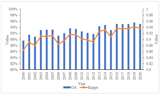 Overall accuracy (OA) and kappa coefficient for each year.