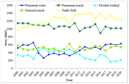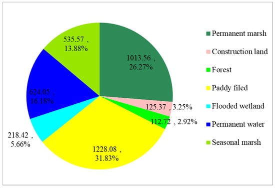 The inter-annual Dongting Lake wetland classification results were obtained using optimal features and the RF algorithm. The results showed that the total area of wetlands in Dongting Lake was 3619.67 km2 in 2020 (Figure 5), accounting for more than 93% of the total area of the three wetland reserves. Natural wetlands, including permanent water (624.05 km2), permanent marsh (1013.56 km2), seasonal marsh (535.57 km2) and flooded wetlands (218.42 km2), accounted for 61.99% of the total area of the three wetland reserves. The paddy field area in 2020 was 1228.08 km2, accounting for 31.83% of the total area of the three wetland reserves (Figure 6).
