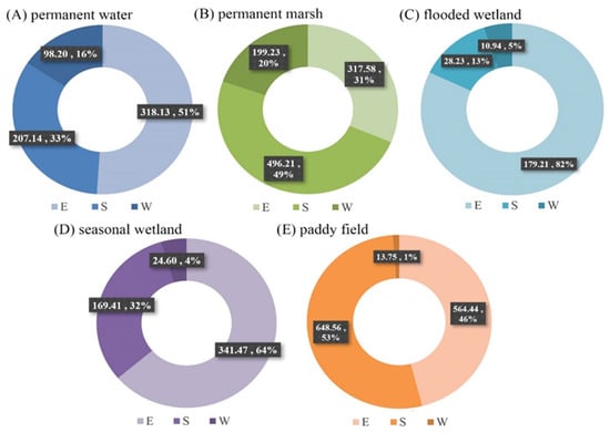 Spatial characteristics of different wetlands in the three Dongting Lake wetland reserves. Note: E represents the East Dongting Lake wetland reserve; S represents the South Dongting Lake wetland reserve; W represents the West Dongting Lake wetland reserve.