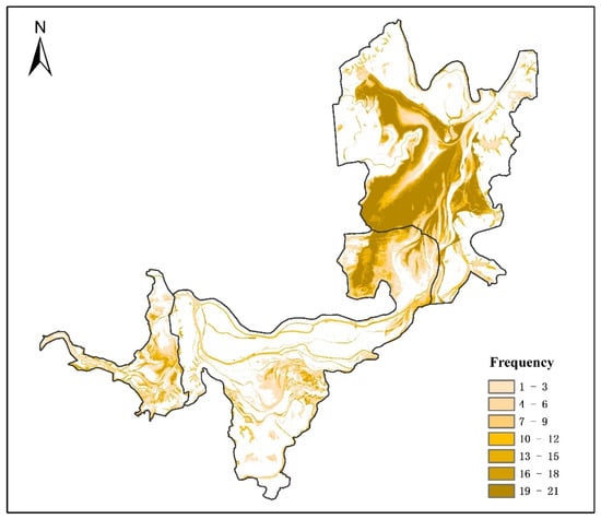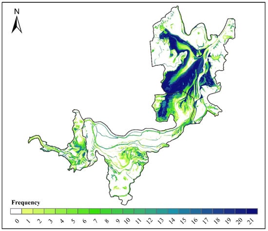 Spatiotemporal dynamic changes in seasonal wetlands. Note: The numbering 0–21 reflects the number of seasonal wetland occurrences in the same location from 2000 to 2020.