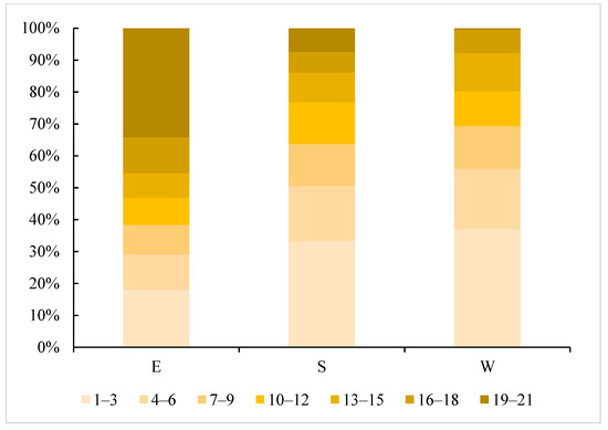As a whole, the acreage of seasonal wetlands (0 < frequency ≤ 21) in the East Dongting Lake wetland reserve, the South Dongting Lake wetland reserve and the West Dongting Lake wetland reserve was 1190.3 km2, 668.7 km2 and 220.2 km2, accounting for 62.8%, 41.7% and 61.8% of each wetland reserve, respectively. Meanwhile, there were still some differences in the spatial characteristics of these three wetland reserves (Figure 9). In the East Dongting wetland reserve, the high-frequency seasonal wetland region (19 ≤ frequency ≤ 21) accounted for the largest proportion of the seasonal wetlands (0 < frequency ≤ 21) area (34%). However, the low-frequency seasonal wetland region (1 ≤ frequency ≤ 3) accounted for the largest proportion in both the South Dongting Lake wetland reserve (33%) and the West Dongting Lake wetland reserve (37%) (Figure 10). Thus, the inter-annual variation in seasonal wetlands is small in the East Dongting Lake wetland reserve, but large in the South/West Dongting Lake wetland reserve.
