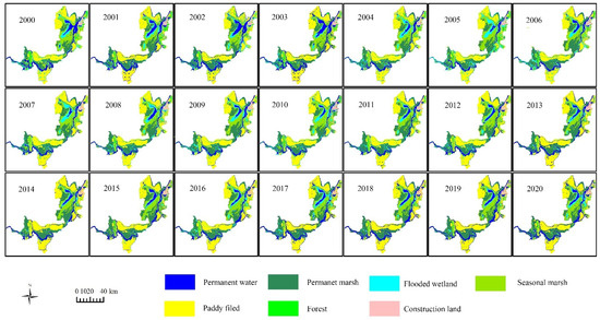 Spatiotemporal distribution of classification results of the three Dongting Lake wetland reserves from 2000 to 2020.