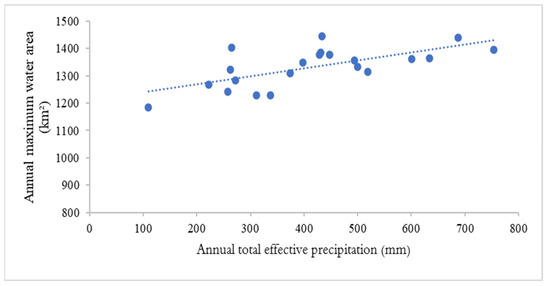 There were a number of factors affecting the surface water acreage of Dongting Lake, such as precipitation, evaporation, runoff, and infiltration. Monthly precipitation and evaporation data from 2000 to 2020 were acquired from the GLDAS Noah Land Surface Model L4 monthly 0.25 × 0.25 degree V2.1 [53], which were downloaded from the NASA Earth Data platform (https://www.earthdata.nasa.gov/, accessed on 6 April 2022). In our study, effective monthly precipitation equals the monthly precipitation minus the monthly evaporation. Then, the annual effective precipitation is obtained by summing the monthly effective precipitation. We used the annual effective precipitation to analyze the potential factors involved in the annual maximum surface water acreage variation. The annual maximum surface water area was the total acreage of seasonal marsh, flooded wetlands and permanent water bodies. Results showed a high positive correlation between the annual maximum surface water and annual effective precipitation (correlation coefficient r = 0.7, p < 0.001), which indicates that the annual maximum surface water area of Dongting Lake increased as the annual effective precipitation increased, and it deceased as the annual effective precipitation decreased (Figure 13). Therefore, the effective precipitation was one of the most important factors that influenced the dynamic changes in the surface water area of Dongting Lake.