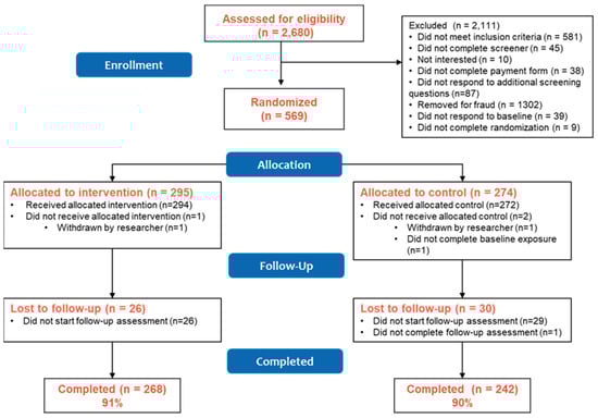 From June to August 2020, 2680 participants were screened and in August 2020, 569 were randomized to either the vape education intervention (n = 295) or control (n = 274) condition (Figure 1), with 294 participants receiving the allocated intervention and 272 receiving the allocated control. Overall follow-up at 1-month (September 2020) was 90% (91% intervention vs. 90% control, p = 0.38). Those retained in the study were generally similar to those lost to follow-up, though a greater proportion of those lost to follow-up were female, identified as white, had ever used a cigarette at baseline, and reported past 30-day smokeless tobacco use at baseline compared to those retained (Table S1). Generally, there remained balance in these characteristics by study condition in the retained sample with the only differences at the p < 0.10 level seen in past 30-day smokeless tobacco use and awareness of the FDA’s Real Cost tobacco prevention campaign (Table S2). Multivariable models of measures at 1-month follow-up controlled for baseline exposure to the Real Cost campaign to adjust for this imbalance, though given the small number of participants reporting smokeless tobacco use (n = 5), we did not include past 30-day smokeless tobacco use as a covariate in those models.