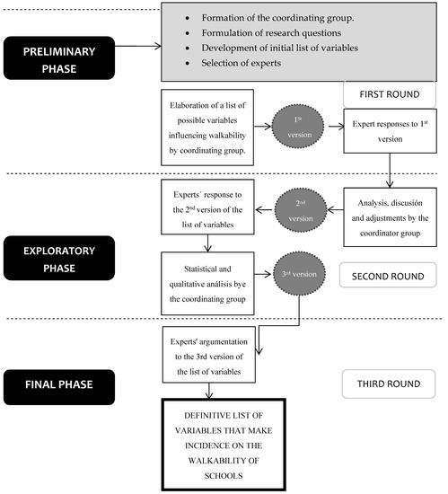 The analysis of the limitations of the above-mentioned instruments is considered essential to examine the factors that determine the walkability of the school environment. In this purpose, the Delphi method has been selected, as it is considered an effective and systematic procedure [26], which allows for the collection of expert opinions on a particular topic in order to incorporate such judgments in the configuration of an instrument and to achieve a consensus through the convergence of the opinions of geographically dispersed experts [27,28].