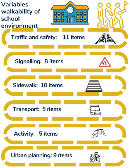 The aim of the present study has been to examine the variables that allow us to evaluate the possibility of schools to assess the walkability of school environments in a simple way through the following factors: traffic and safety, signage, sidewalks, transport, activity, and architecture. The environments of the educational centers were analyzed instead of taking the areas of residence of the students, similar to the study by Macdonald et al. [19].