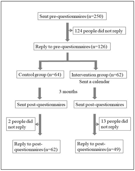 The subjects were local older people who participate in physical function measurement meetings in Kaizuka City every year [11]. Participants answered the questionnaires in July 2021 and November 2021. The preliminary questionnaires were sent to 250 people in July, and the 126 people who returned the questionnaires were divided into a control group (n = 64) and an intervention group (n = 62). The intervention group completed a calendar task for 3 months. In November, the post-event questionnaire was sent out. The analysis included 62 people in the control group and 49 people in the intervention group who responded to the survey. The data of these 111 people were used in the final analysis (Figure 1). Referring to previous studies [12], the sample size was calculated post hoc using Gpower version 3.1.9.7 computer software with a two-tailed significance level of 0.05, and a power of 0.8; the estimated number of people was 90, and the 111 people included in this study were thus considered appropriate. Participants were allocated using a stratified randomization method, with stratification by sex, age and frailty level.