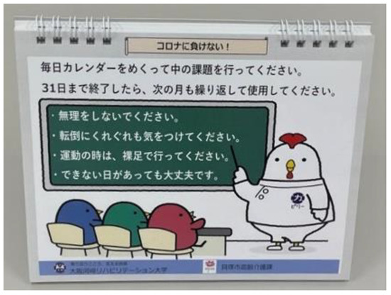 It has been proposed that it is important to address frailty prevention from the three aspects of nutrition, exercise, and social activity during the COVID-19 pandemic [28]. Although the task calendar created in the present study is an excellent method for being able to do it alone at home, it impedes social involvement. It would be most effective to incorporate the various intervention methods described above, including the present method, according to the risk of infection with social activities and the degree of movement restriction during the COVID-19 pandemic.