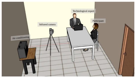 To accomplish the study, a controlled environment for the acquisition of the thermal images was created [10] inside a room measuring 2.5 m long, 3 m wide, and 2.5 m high, with a temperature of 20 ± 2 °C, constant lighting, without external incidents of light, and relative humidity of 45 to 60%. To achieve this goal an air conditioning system was used (Figure 1).