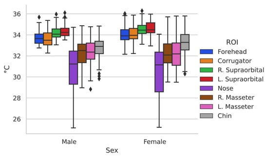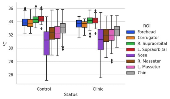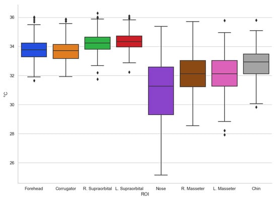 According to what is shown in Figure 3, the trends can be seen in terms of the temperature shown in the different regions of interest evaluated, the one with the greatest variation being the nose, which is one of the most studied and in which other authors have already found that they present consistent results [8,36]. It is interesting to remark that temperatures in other regions of interest are clustered with minor variations as in the case of supraorbitals.