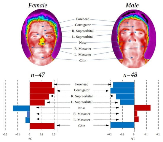 The male gender group presented a higher temperature in the lower part of the face with exception of the chin while the female group in the upper part, while in the masseters, there are no outstanding differences. The differences found between genders are related to the physical composition of each one as addressed in [28], and this can also be seen in the face where it has been found that in general, men have a higher temperature than women [37]; statistical significance was found (p < 0.05) in facial temperature between genders for the upper part of the face (forehead, corrugator, and right supraorbital), but not for the other ROIs.