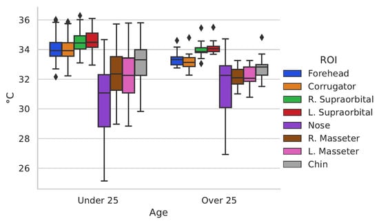 The difference in temperature by age in the ROI can be better appreciated in Figure 7.