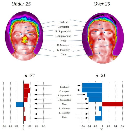 The temperature differences found according to age are striking, with the greatest difference in the first 5 ROIs (forehead, corrugator, right supraorbital, left supraorbital, and nose). The difference in temperature with respect to age can be derived from the change in metabolism suffered as people age. As can be seen in Table 4, the changes between the group under 25 years of age and the rest are statistically significant in the 4 ROIs of the upper part of the face, presenting a p-value of less than 0.05, while the lower part is not.