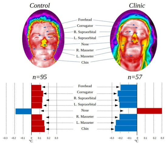 The thermal variation shown in Figure 9 according to the clinical and control group shows that there is a higher temperature in the face of the control group except for the nose, which can be produced by the amounts of stress to which people who are fighting against a disease or even be symptoms of it, are subjected. Studies have shown that people hospitalized or facing diseases such as cancer present symptoms of high stress and anxiety [45,46], which is also observed in people with other diseases such as COVID-19 [47] and others [48,49,50].