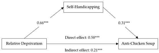 Indirect effect of relative deprivation on anti-chicken soup endorsement via self-handicapping in Study 2. Note. Relative deprivation (coded as 0 = control, 1 = relative deprivation). Values are standardized coefficients. *** p < 0.001.