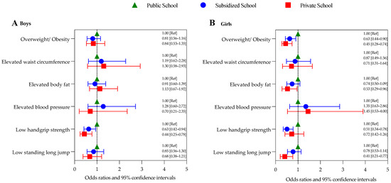 Odds ratios and 95% confidence intervals of having risky conditions according to school type in (A) boys, and (B) girls. Models for overweight/obesity and elevated body fat were adjusted for age; all other models were adjusted for age and body mass index Z-score. Ref, reference.