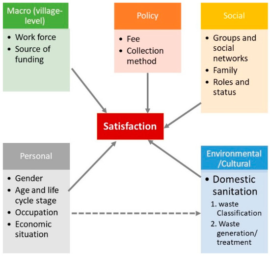 Theoretical framework of satisfaction with rural waste management services (partially adopted from [49]).