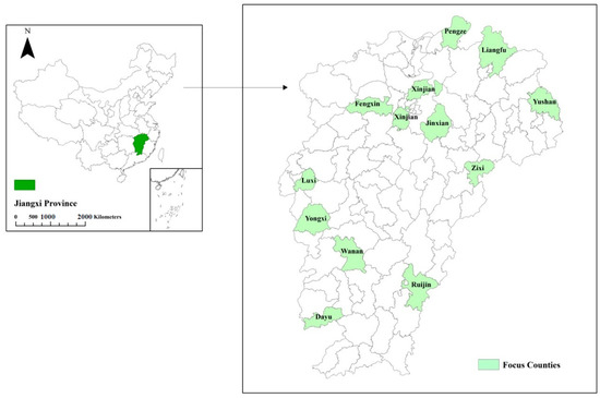 The study area (Figure 2) consists of counties in different parts of Jiangxi province. The province is located in the middle and lower reaches of the Yangtze River, with abundant rainfall and sufficient sunlight. There are plain basins for rice planting, hills suitable for cash crops, and economic forests. The overall per capita disposable income is 28,016 RMB, ranking 14 among all regions in China, and the rural per capita disposable income is 16,981 RMB, ranking 10. Jiangxi’s agricultural sector accounts for 14.1 of the provincial GDP% [59]. The provincial HDI is 0.74, with the 19th ranking in China [60].