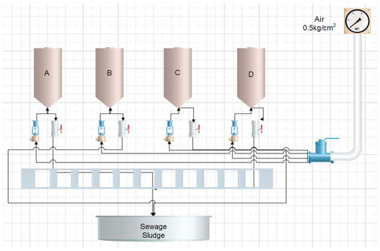 For treatment A, BM was added with the bacteria inoculum (1 × 107 CFU/mL), 0.05% molasses and aeration of 0.5 kg/cm2; in treatment B, the BM was added with 0.05% molasses and aeration (0.5 kg/cm2) but without bacterial inoculum. In treatment C, the mix of BM, bacterial inoculum (1 × 107 CFU/mL), 1.6% calcium oxide, 0.05% molasses, with aeration (0.5 kg/cm2) was tested. Finally, Treatment D was taken as a control experiment, so only BM was placed inside SBR.