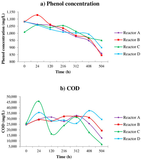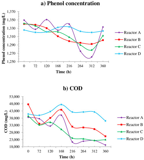 In this assay, the reduction in phenol represents less than 3% of the initial concentration in the four reactors (Table 4): 1.2% for reactor A, 2.9% for reactor B, 2.2% for reactor C and 0.2% for reactor D (control conditions). COD removal was also greater in reactor A (50.1%), and showed decreasing removal values from reactor B (47.0%) and C (41.8%), being as low as 11.7% in reactor D. In this same test, reactor D, which is a control reactor, as in the previous experiment does not show changes in time. According to the results, the combination of microorganisms plus lime represents the correct conditions to treat wastewater rich in phenolic compounds (Figure 3a,b).