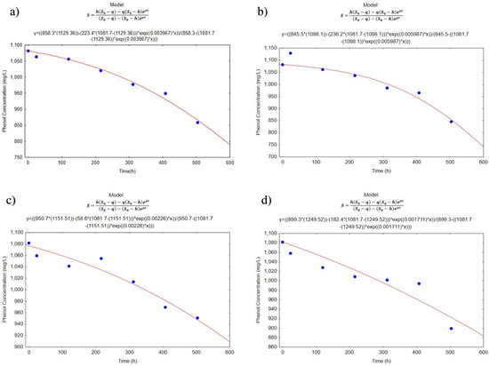 Figure 4 and Figure 5 present the graphs of the experimental and theoretical values obtained with the Quiroga and Sales model [27]. In reactors A (Figure 4a and Figure 5a) and B (Figure 4b and Figure 5b), it can be estimated that bacterial populations require a period of acclimatization of approximately 100 h, as the decrease in contaminant concentration is too slow during the first days of treatment. With this same analysis, reactor C (Figure 4c and Figure 5c), where the lime was applied shows a decrease in acclimation time and after that period there is an increase in the amount of phenol and then a decrease. In Treatment D (Figure 4d and Figure 5d), it can be observed that the concentrations of phenol are maintained without major changes during the test time. This stability is possibly due to the reactor not being inoculated or maintained with aeration.