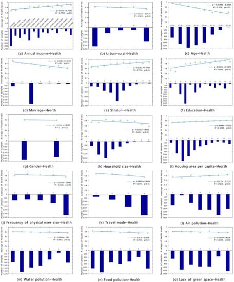 First, basic statistical analysis charts were used to explore the coupling relationships between the explanatory variables and health. In the results of the statistical analysis, the health level varied with different individual social characteristics, economic level, travel preferences, and environmental pollution with the corresponding linear trends, as shown in Figure 1.