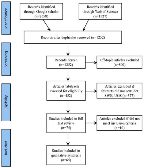 Of the total number of publications surveyed, 2558 references were from Google Scholar and 1527 references from Web of Science. Approximately two-thirds of the literature was removed because it depended heavily on the relationship between the variables (e.g., insufficient information). After excluding these studies, 452 articles were left to be read in detail. Next, conceptual studies or studies without a relevant empirical component were excluded to obtain more evidence with empirical support. Finally, 65 articles were included in the literature review analysis for thematic analysis. Most of these articles were from English language journals, with five being in Chinese. More information about these studies is detailed in Figure 1.