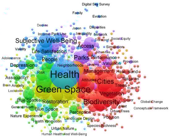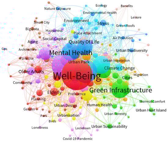 The visualization of the term maps is provided in both Figure 2 and Figure 3. Figure 2 demonstrates the main terms related to green space. Figure 3 illustrates the main terms related to well-being in the selected articles. Each term is represented by a circle, the size of which reflects the number of publications in which the term was found, while the distance between every two terms provides key indicative information about the relevance of the term. The color indicates the group of terms with relatively strong relevance. In these two visualizations, it is evident that a high degree of symbiotic relationship exists between well-being, health, subjective well-being, green space, green infrastructure, and biodiversity. Clustering the strength of correlation between these terms provides us with the evolutionary path of disciplinary knowledge and the research hotspots and trends in this field for the next review studies, which helps to further identify the research objects and observation topics.