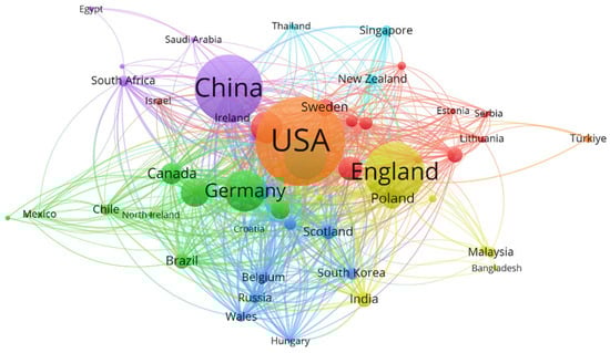 Figure 4 shows the mapping analysis of the network of cooperating countries. It reflects the cooperation between countries in the research on the related areas of urban green space and the well-being of the elderly, as well as the degree of cooperation. The larger the node, the more productive the research is in this area. The length and thickness of the links between nodes represent the collaborative relationships between countries. The country with the highest total link strength is the United States, followed by China and the United Kingdom.