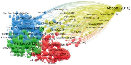 Figure 5 displays the graphical analysis of bibliographic coupling. Experts from sociology, psychology, gerontology, epidemiology, urban design, and land-landscape planning attach great importance to the intersection of green space and well-being. Moreover, what is visible in this visualization is that most scholars are more connected to each other and have very strong collaborative relationships. Only a small number of scholars have published independently.