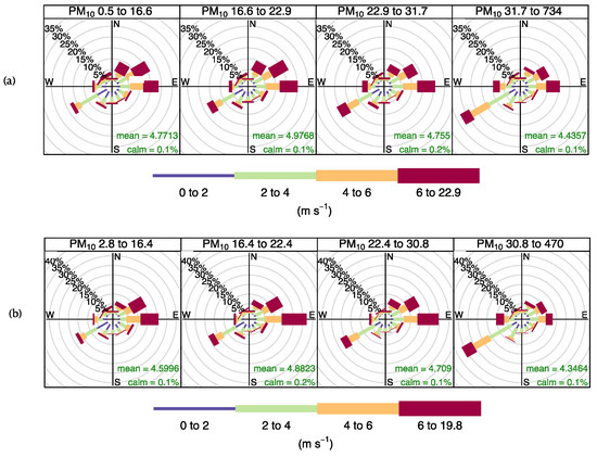 Persistence of PM10 observations by wind direction (%) at Sile station: (a) pre-lockdown period; (b) during-lockdown period.