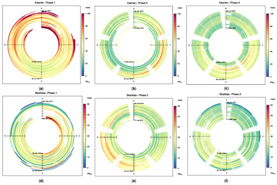 Directional trends of PM10 (μg/m3) and PM2.5 (μg/m3) for Esenler and Besiktas stations, respectively: (a) Esenler station PM10 (μg/m3) trends for Phase I; (b) Esenler station PM10 (μg/m3) trends for Phase II; (c) Esenler station PM10 (μg/m3) trends for Phase III; (d) Besiktas station PM2.5 (μg/m3) trends for Phase I; (e) Besiktas station PM2.5 (μg/m3) trends for Phase II; (f) Besiktas station PM2.5 (μg/m3) trends for Phase III.