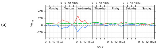 The biannual-term analyses of the Phases are presented in Figure 5. The red-colored functions indicate the previous sub-period, the green-colored functions show the results during the lockdown span, and the blue-colored functions show the differences between these two periods. The thick lines of each color indicate the mean values, and the shaded extensions of the same color indicate the 95% confidence interval around the mean. According to the comparison of the Phases, the hourly and diurnal changes in PM10 and PM2.5 showed air quality improvement. In particular, the diurnal and weekly changes indicate that the lockdowns significantly helped reduce the traffic and industry-related PM10 and PM2.5 pollutants, especially for the exceedance values for each station. For example, in the Kadikoy station, for Phase III, PM10 hourly changes for weekdays do not exceed 75 μg/m3 (Figure 5c). In comparison, the maximum limit reaches 400 μg/m3 (Figure 4a) and 100 μg/m3 (Figure 5b) for Phases I and II, respectively.